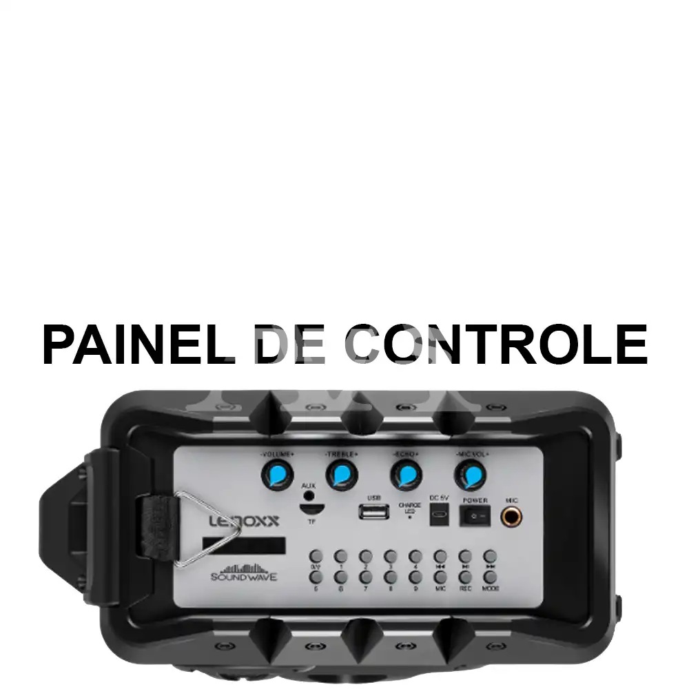 Painel de controle (todos os controles da caixa num só lugar. Controle desde o volume até o modo graves e agudos. Conta ainda com display digital para auxiliar visualmente a troca de funções e estações de rádio): sim