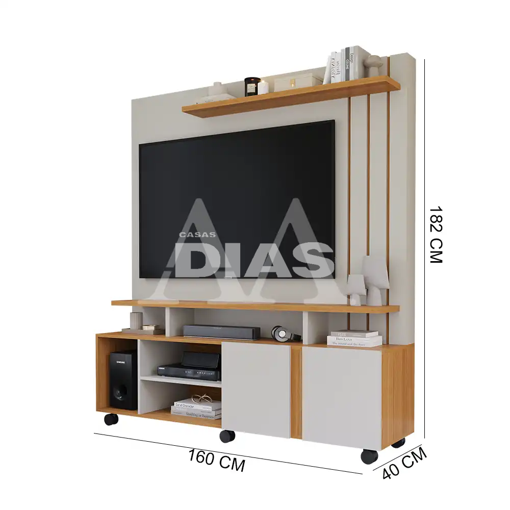 O Home Valência da Permóbili é um móvel moderno e funcional, ideal para salas de estar que precisam de organização e estilo. Ele comporta TVs de até 55 polegadas e oferece amplo espaço para eletrônicos e decoração.